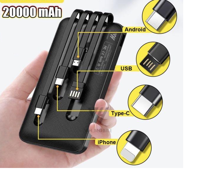 Portable 20,000 mAh Power Bank with Built-In Mirco + Type C + Lightning + USB Output Cables High Capacity – 20000mAh Capacity has enough power to keep you going for days. Powerbank with extended